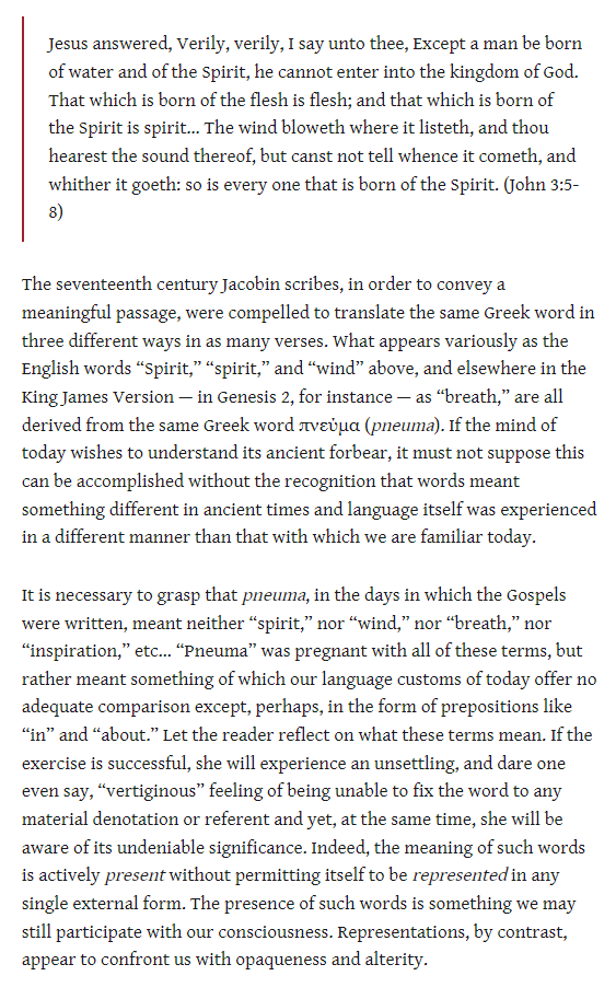 For example: “word” used to mean, among other things, the invisible counterpart to a thing (roughly corresponding to our understanding of the Platonic idea, a pre-existent spiritual being). Or the truth-bearing expression of a person’s understanding or will. This is the origin of those curious idioms which now seem scarcely comprehensible—and certainly impossible for most of us to utter in the first person—such as “I give you my word,” “my word is my bond,” etc.